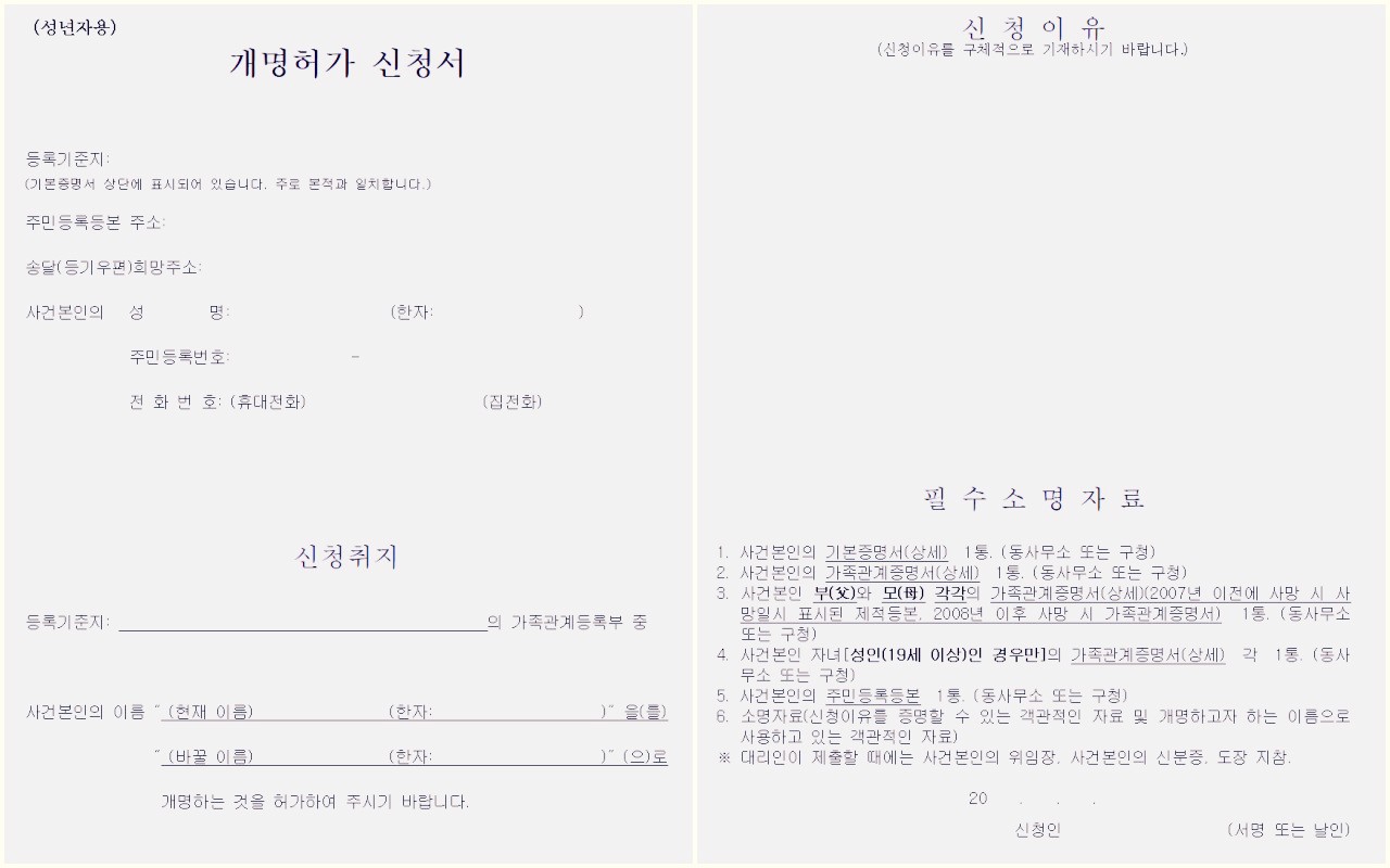 - 개명허가신청서 (가정법원에서 양식 받기)