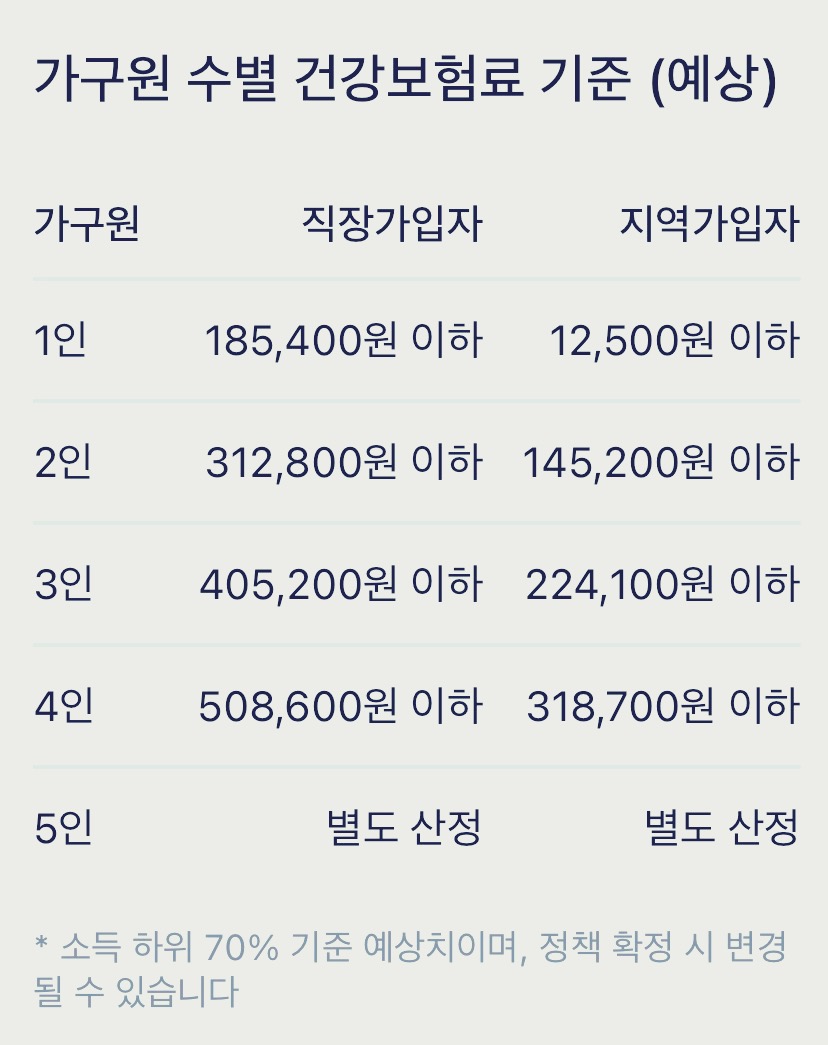 1인 가구는 월 소득 약 385만 원 이하, 직장가입자 건강보험료 본인부담금 약 18만 5천 원 이하가 기준이다. 2인 가구는 월 소득 약 630만 원 이하, 건강보험료 약 31만 3천 원 이하다. 3인 가구는 약 804만 원 이하, 4인 가구는 약 974만 원 이하다.