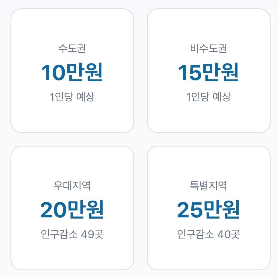예를 들어 비수도권 일반 지역에 사는 4인 가구라면 1인당 15만 원 × 4명 = 60만 원이 예상 지급액이다. 인구감소 특별지역 4인 가구라면 25만 원 × 4명 = 100만 원이다.