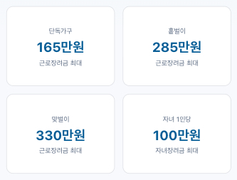 2025년 귀속 근로·자녀장려금 계산기. 가구유형, 총급여, 재산만 입력하면 예상 장려금을 바로 확인할 수 있습니다.