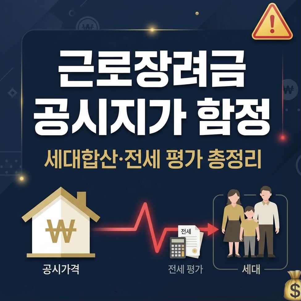 2026 근로장려금 재산 평가는 공시지가 기준이지만, 부채 차감 불가와 세대합산이 진짜 함정입니다. 특히 부모 집에 얹혀사는 중년층이나 직계존비속에게 전세 든 분들은 예상보다 훨씬 높게 평가될 수 있어요.