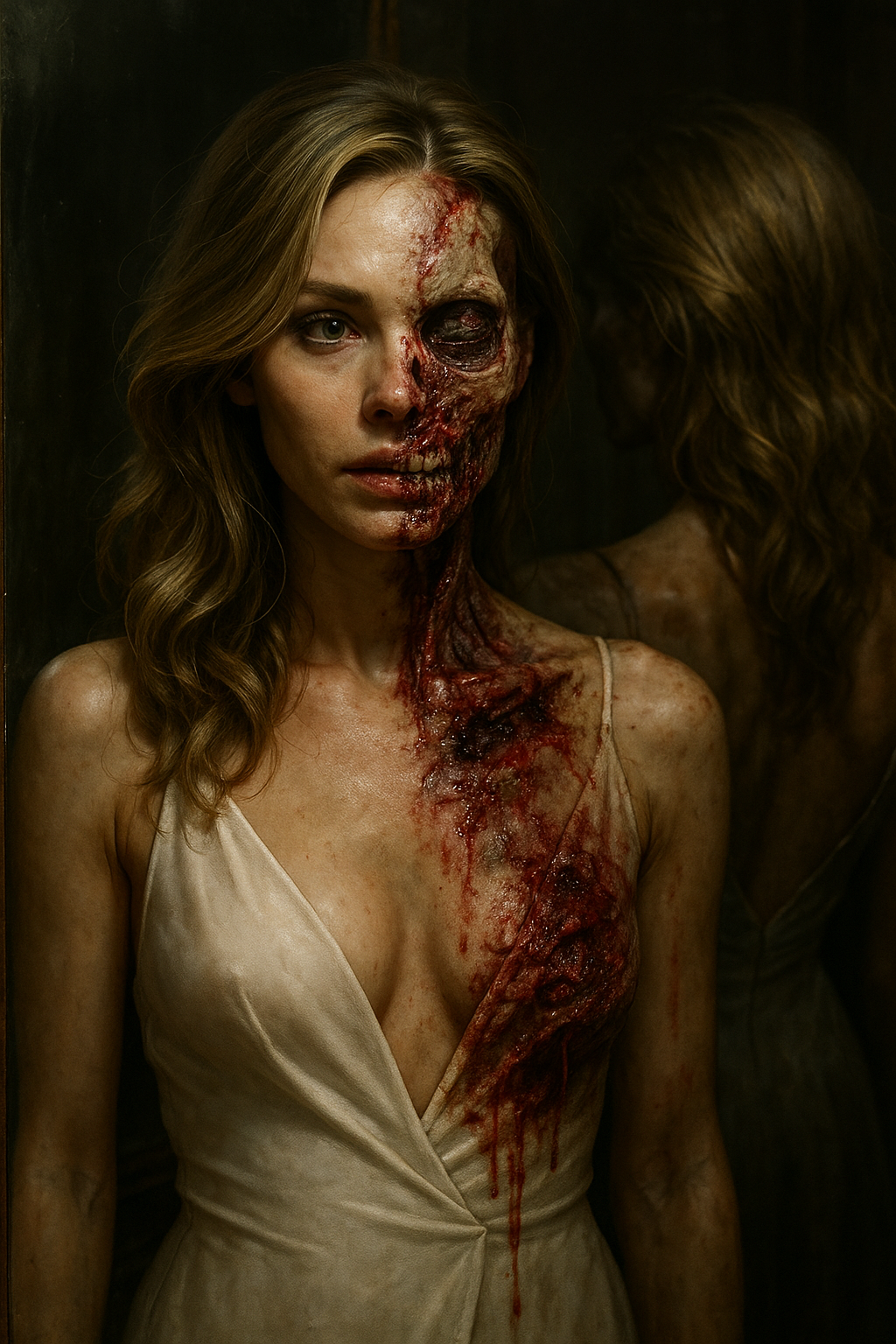 거의 완전히 좀비가 된 여성이 흰색의 깊게 파인 드레스를 입고 있다.